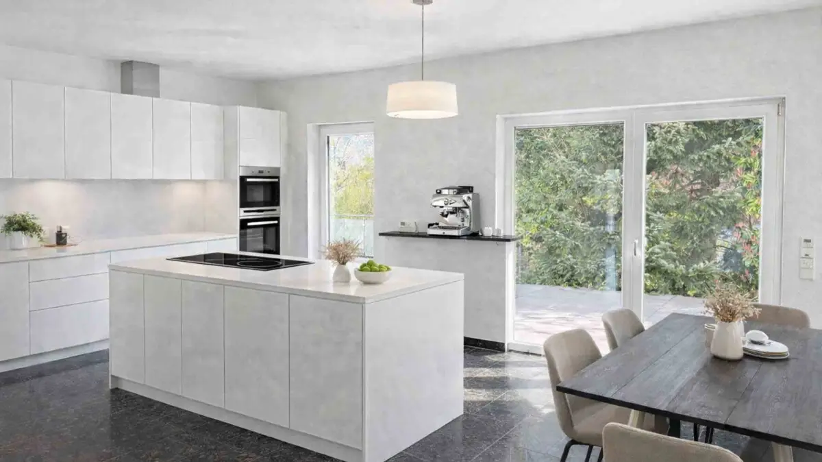 Die offen gestaltete Küche, mit rund 25 m² Fläche, bietet Platz für schöne Stunden mit der Familie und Freunden. Der Dielen- und der Küchenbereich haben einen hochwertigen Emerald Pearl Granitboden.